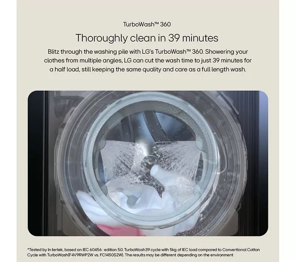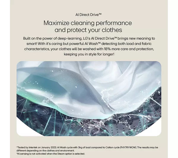When you're pushed for time, this LG washing machine's TurboWash 360 program is on hand to help. It blasts your clothes from every angle, so a 5 kg load will be ready in under 40 minutes. If you suffer from sniffles, sometimes a normal wash just won't cut it. The Steam function bathes your clothes in steam to get rid of up to 99.99% of germs, pollen and other nasties. And the AI Direct Drive analyses the weight and softness of your clothes to work out the best movement during the wash. It helps to prevent fabric damage, so you can stay in style for longer.