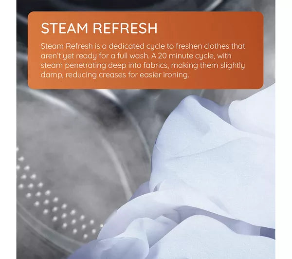 Stains don't have to spell the end for your favourite clothes. This Hotpoint washer dryer's Anti-Stain technology shifts marks without needing pre-treatment. It uses just the right water, temperature, detergent and movements to lift stubborn stains. The Steam Refresh cycle helps to freshen clothes and make them easier to iron. It can even remove up to 99.9% of common bacteria, without any need for harsh chemicals. And when the cold winter months roll around, your woolly jumpers will stay snuggly and soft with Wool Care. It's like a warm hug for your woollies!